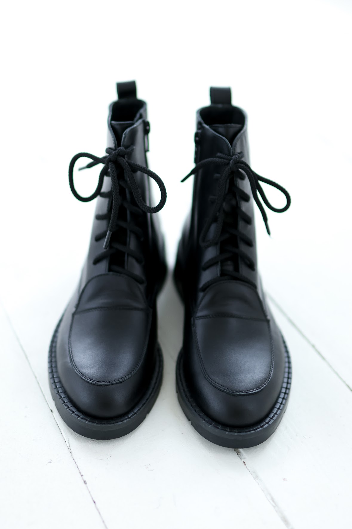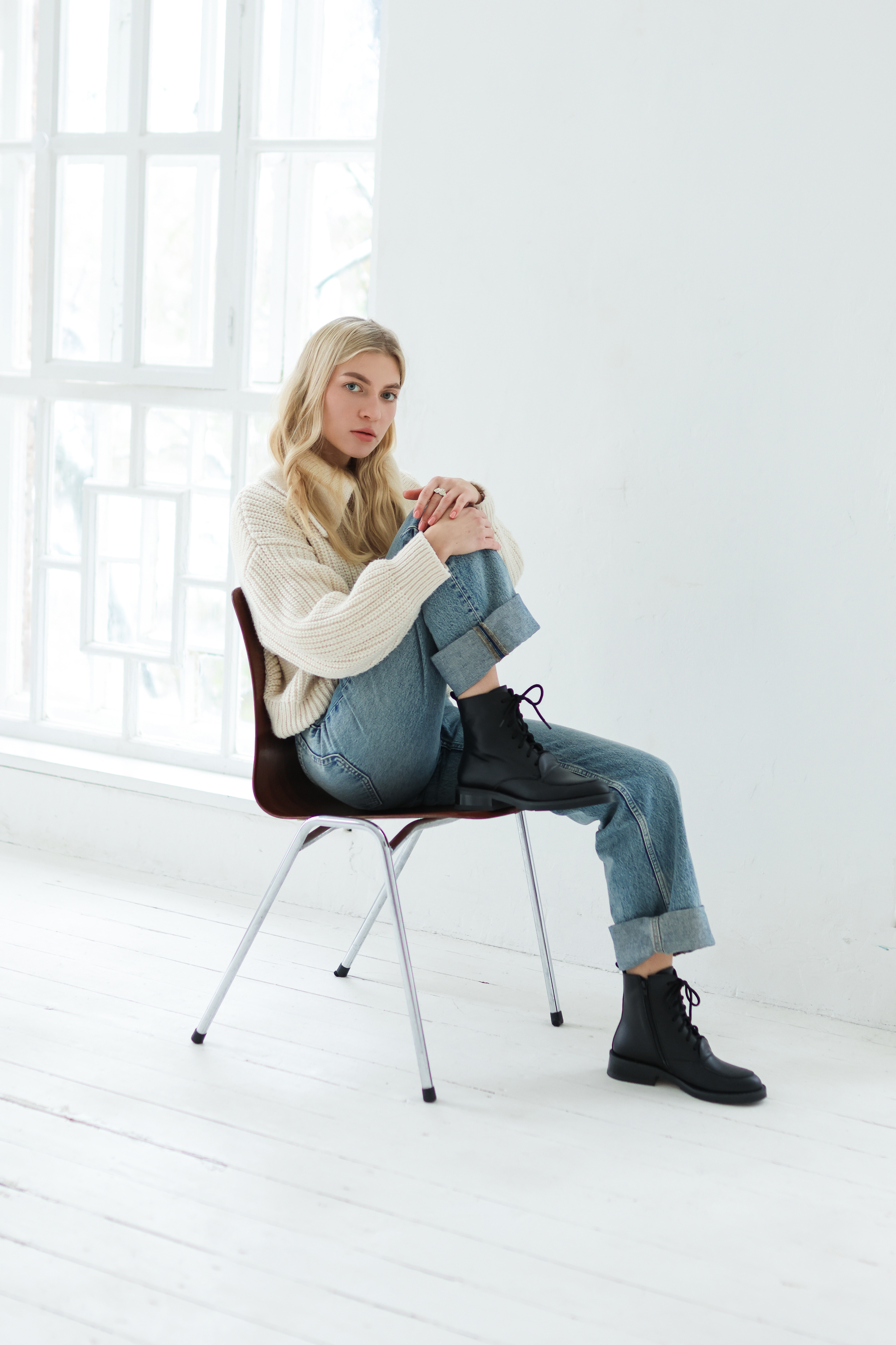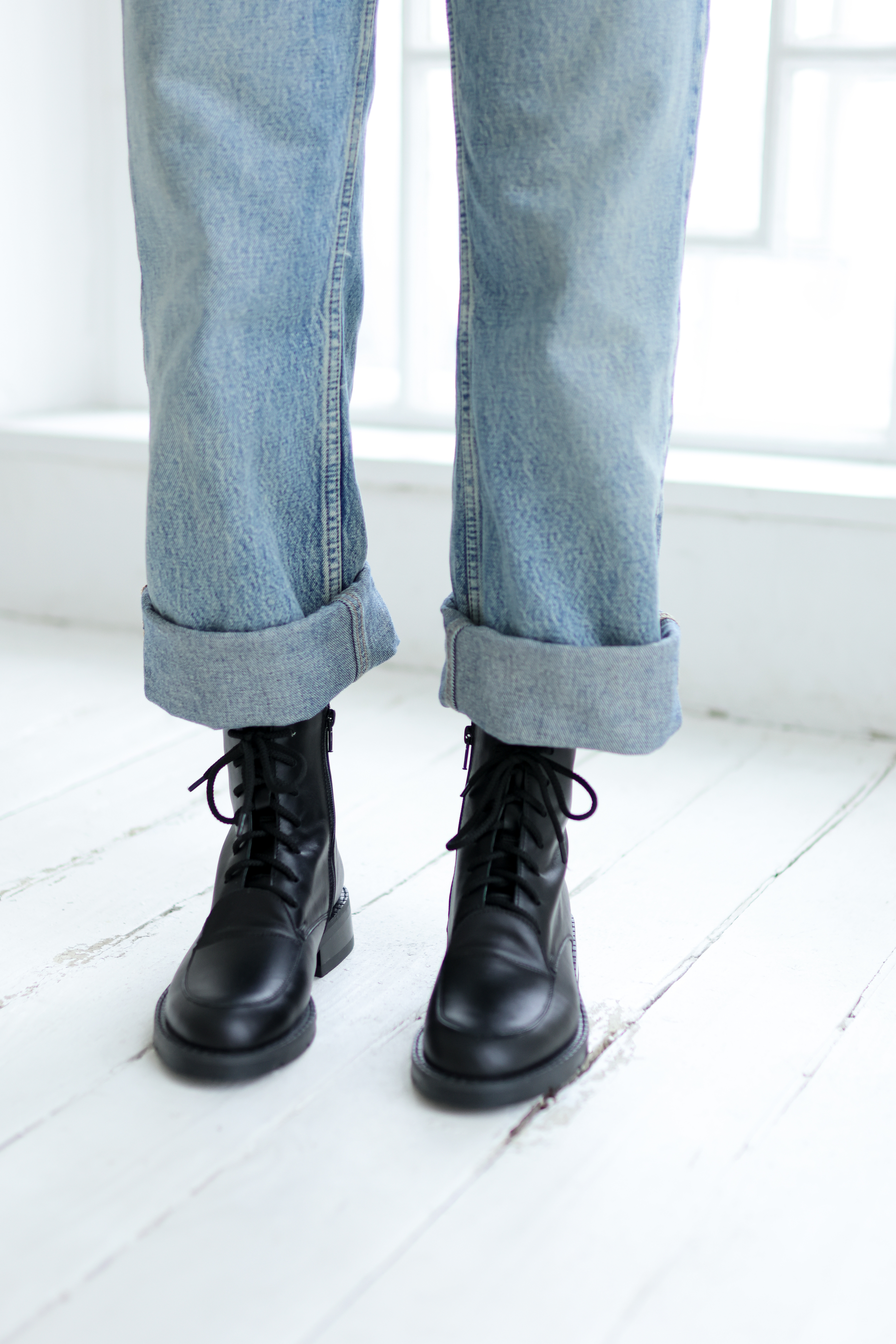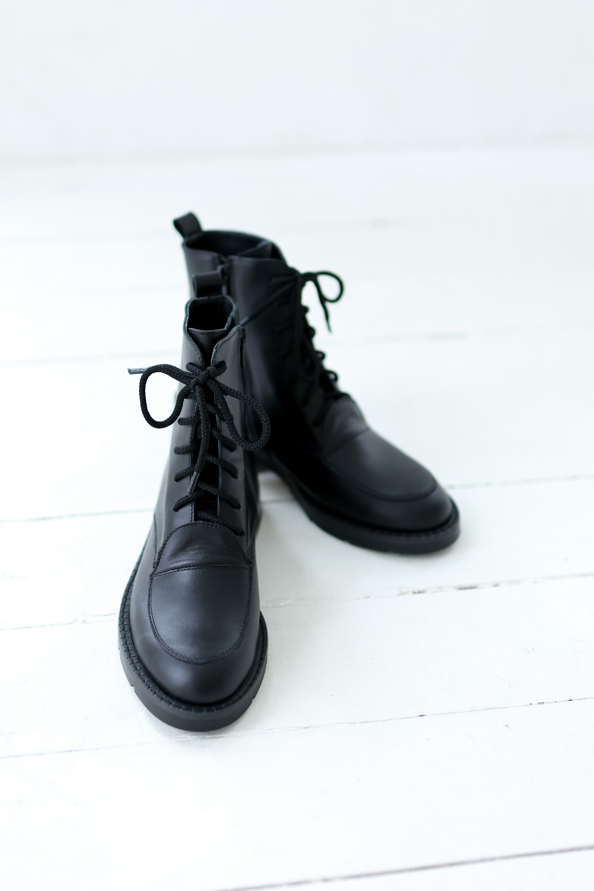 Ботинки-шнуровка на плотной подошве с рантом, в черной коже на кожаном подкладе. Особая деталь этой модели – стильный язычок под шнуровкой, который по желанию можно спрятать под шнуровку. Модель идет на боковом замке для удобного надевания. Эта модель подходит в том числе для поздней осени.