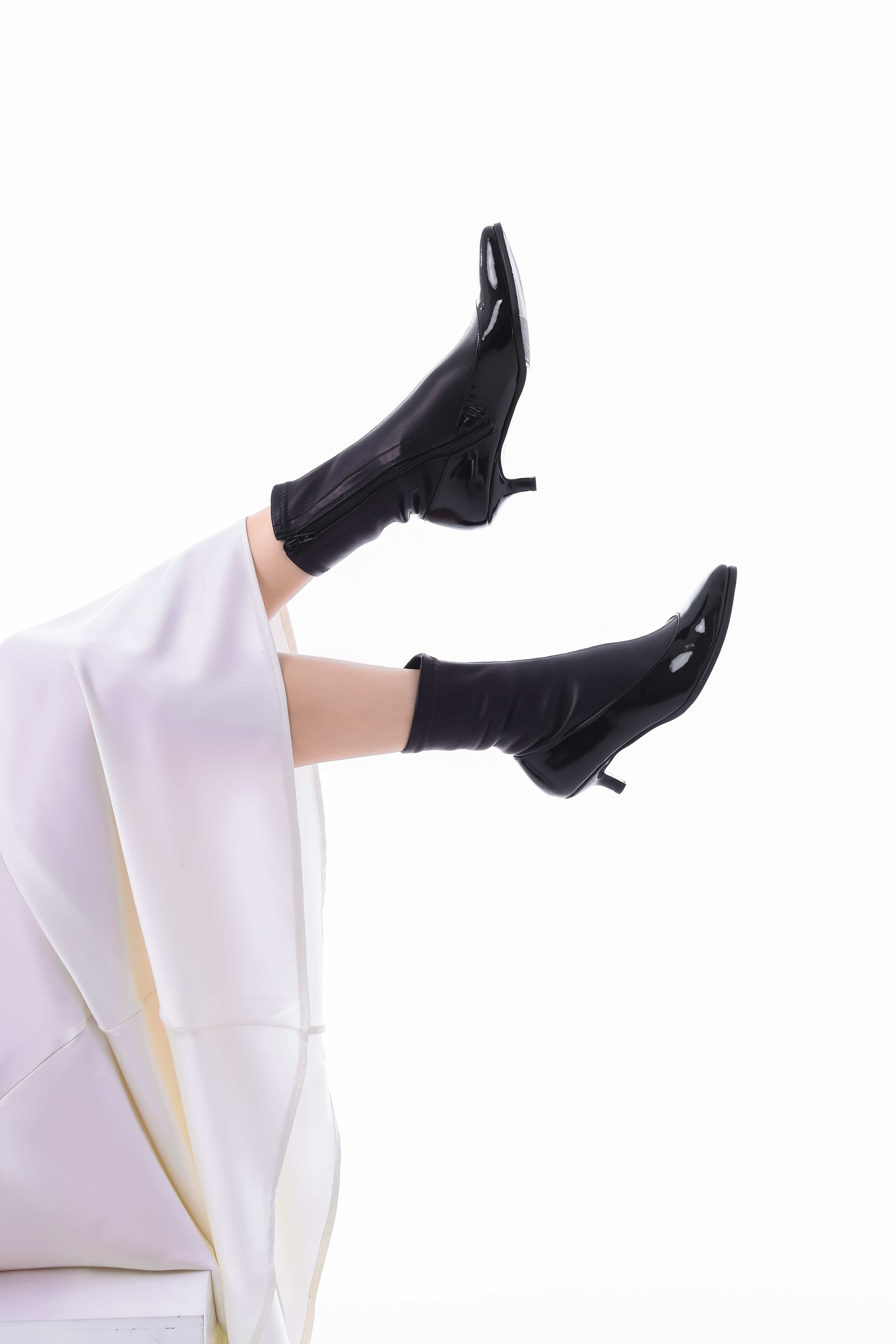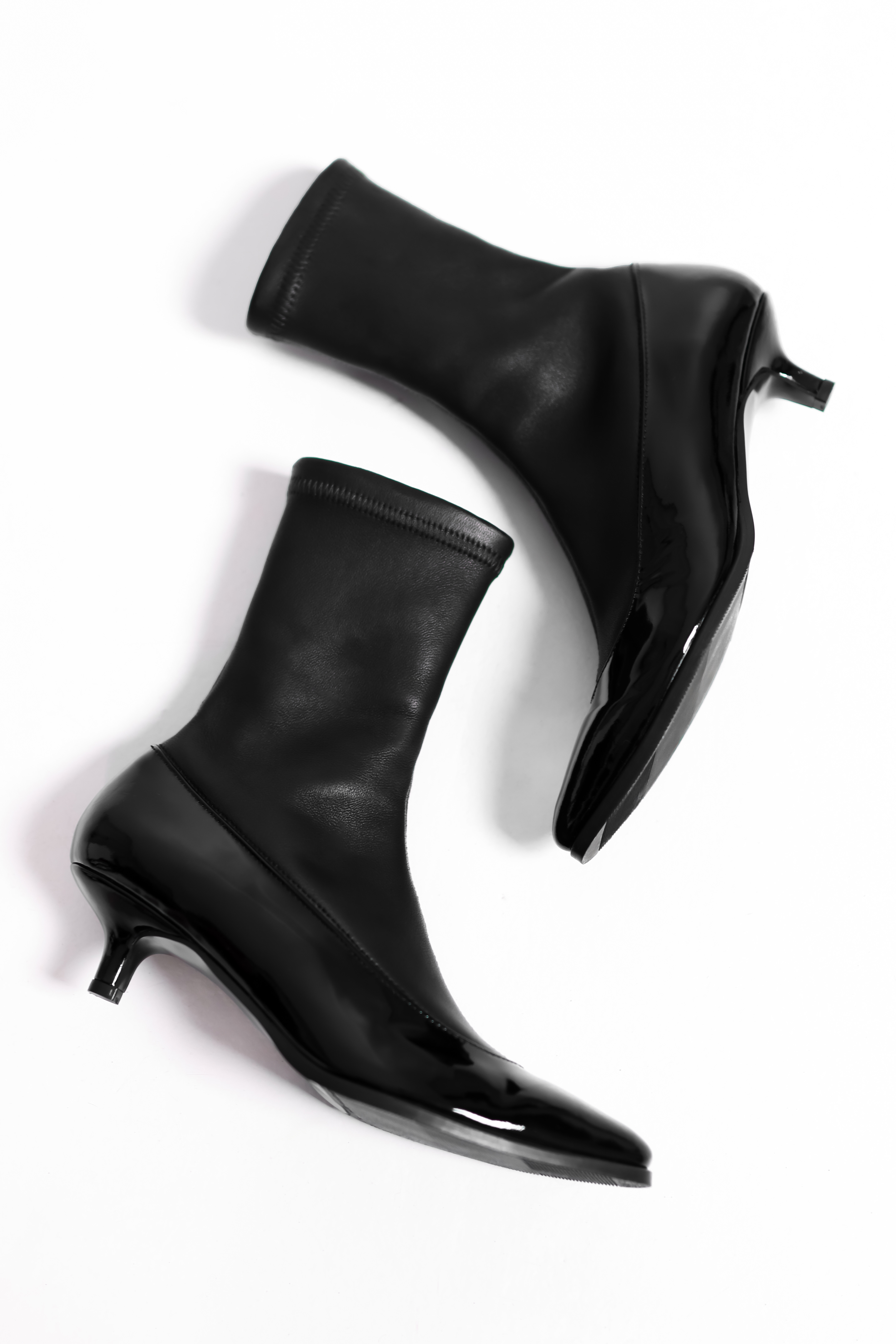 Belle зі стрейч-шкіри та лакованим мисом — це поєднання витонченості й сучасного мінімалізму. М’який еластичний матеріал ніжно облягає ногу, створюючи плавну лінію силуету. Лакована деталь на мисі додає вишуканого контрасту та підкреслює елегантний характер моделі. Боковий замок забезпечує зручність у щоденному використанні, а підбори kitten heels заввишки 3 см надають легкого підйому, зберігаючи комфорт протягом усього дня.